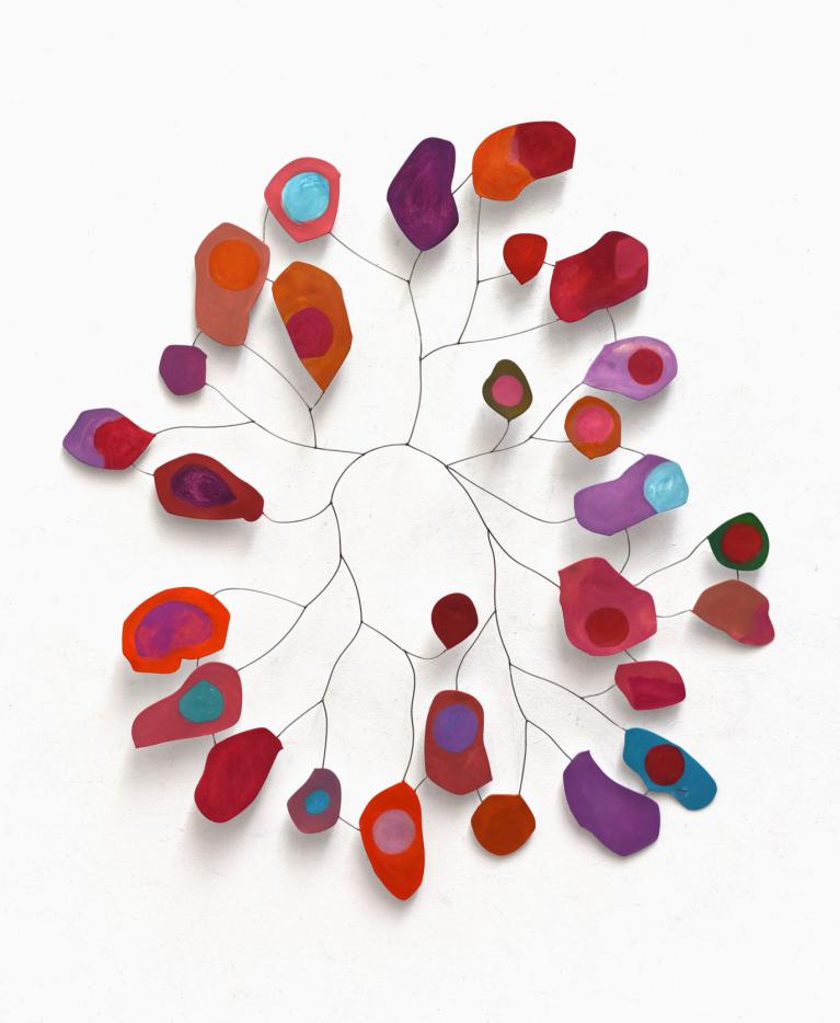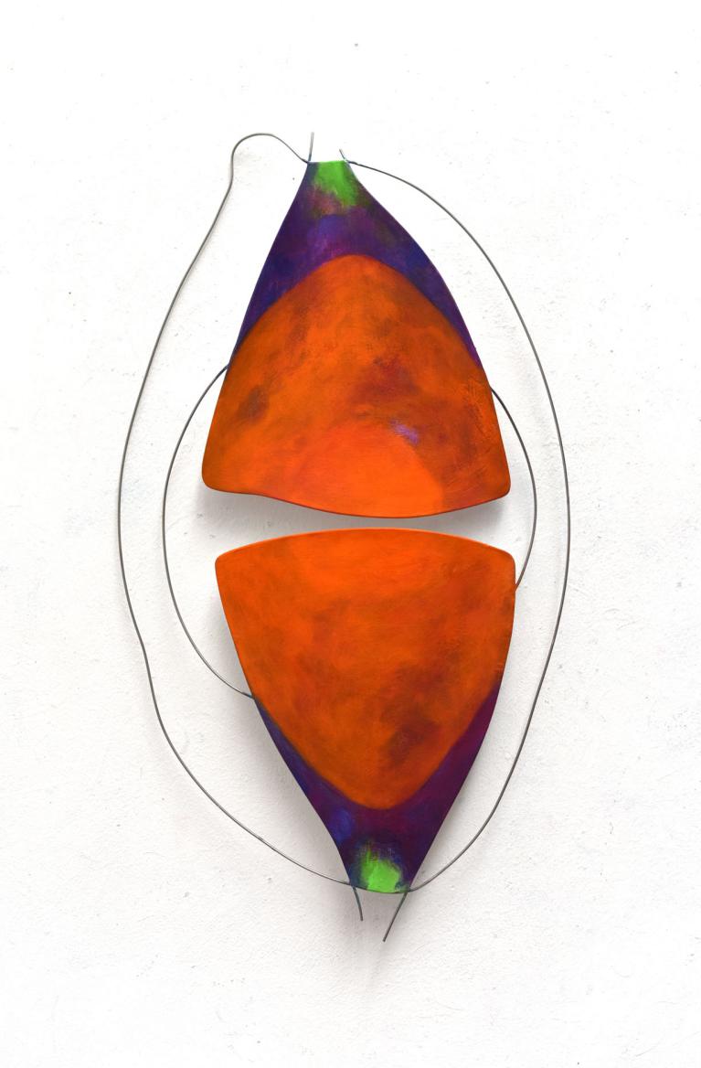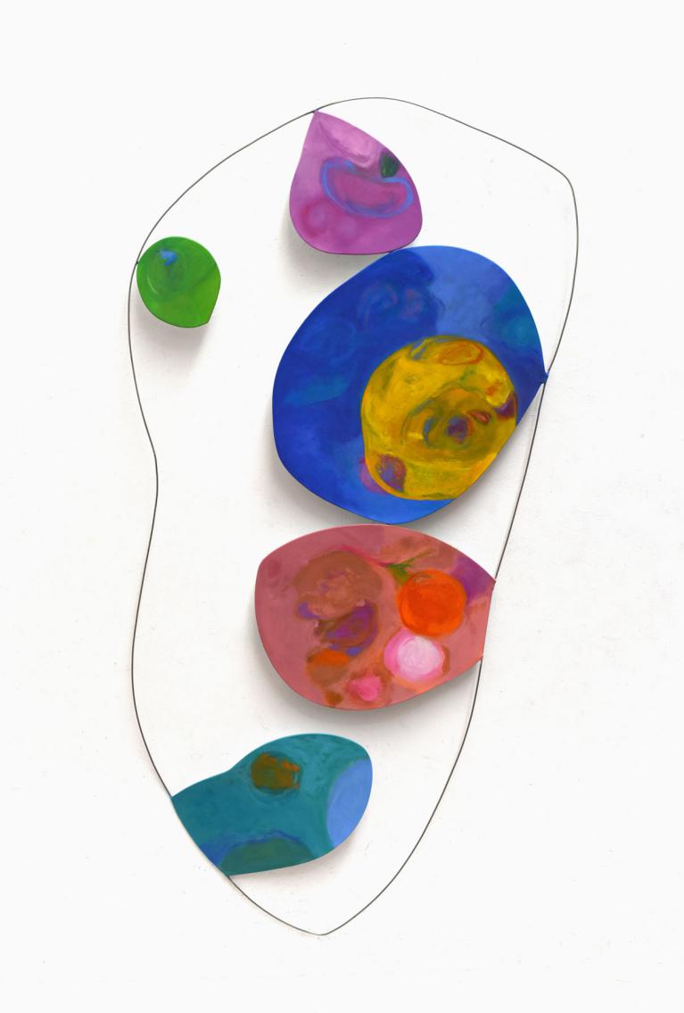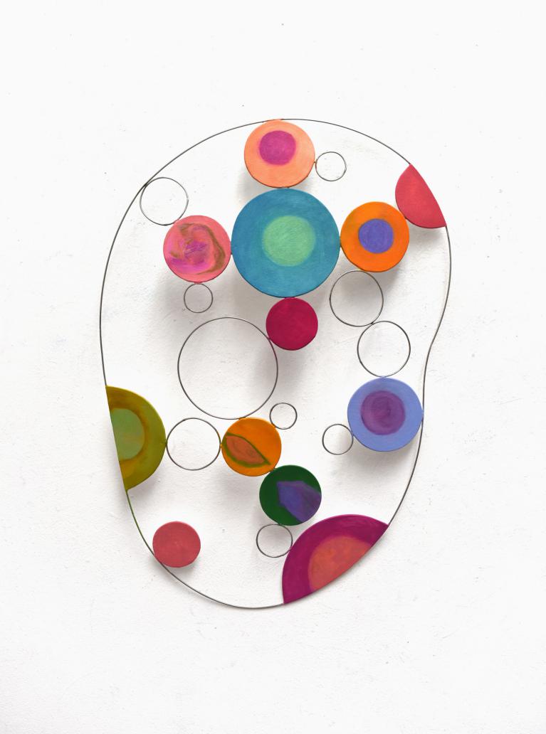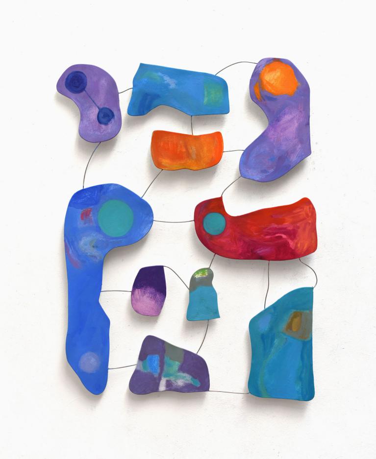 Elle recouvre la forme, lui apporte sa dimension organique. Elle fait entrer la ligne, le dessin, dans l'espace de notre réalité. Elle répond à la forme...mais pas seulement : elle incarne aussi la question que la forme se pose, et projette dans l'espace où je suis, mes questions sans réponses. Par sa métamorphose objective, la peinture sur la forme ouvre un dialogue avec nous. Elle est l'exact reflet de la conscience de l'objet. Elle signe son étonnement d'être, comme nous nous étonnons d'exister.