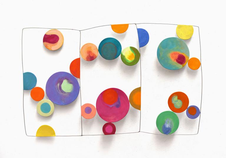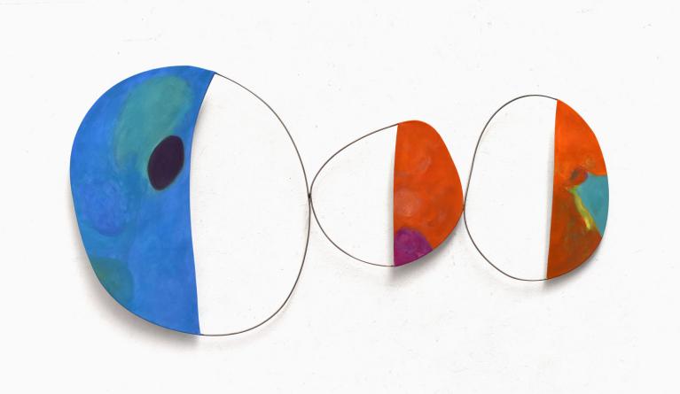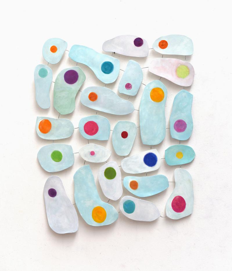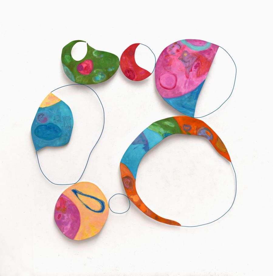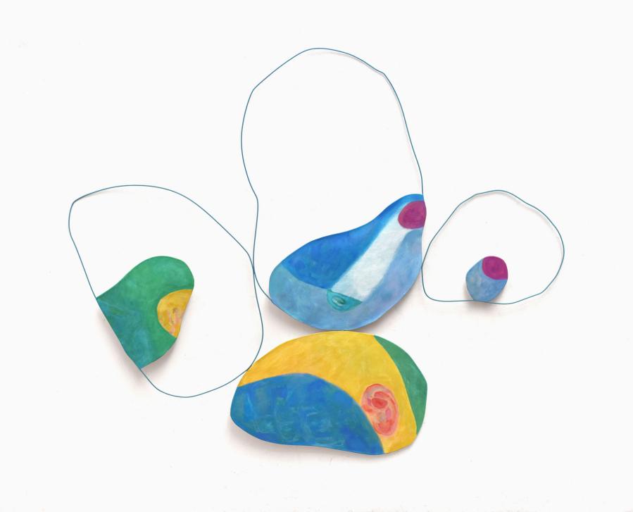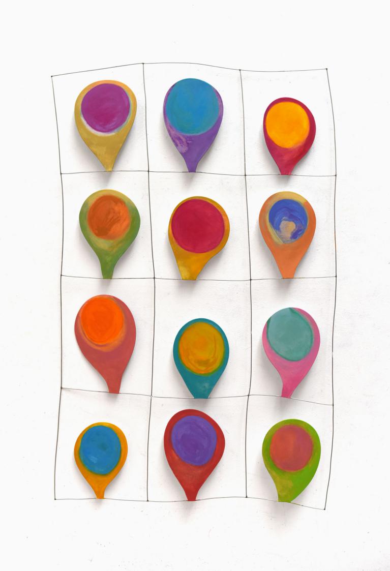 Elle recouvre la forme, lui apporte sa dimension organique. Elle fait entrer la ligne, le dessin, dans l'espace de notre réalité. Elle répond à la forme...mais pas seulement : elle incarne aussi la question que la forme se pose, et projette dans l'espace où je suis, mes questions sans réponses. Par sa métamorphose objective, la peinture sur la forme ouvre un dialogue avec nous. Elle est l'exact reflet de la conscience de l'objet. Elle signe son étonnement d'être, comme nous nous étonnons d'exister.